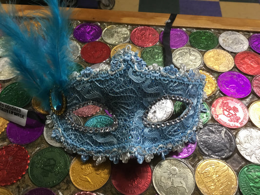 ASSORTED COLOR BRAIDED GLITTER MASK WITH FEATHER